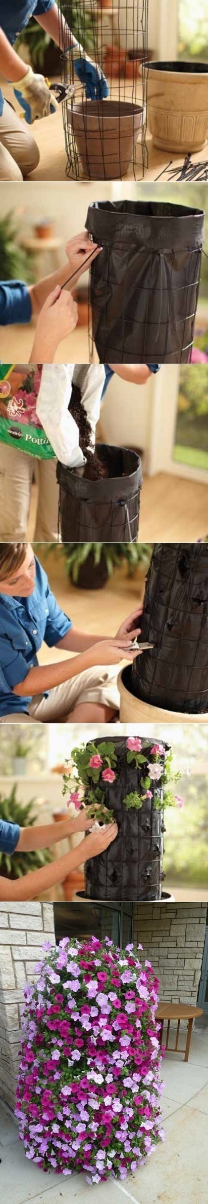 Basically, it's a ring of galvanized fencing lined with landscape fabric, then filled with potting soil. The petunias were planted through slits in the landscape fabric. This looks like a pretty easy do-it-yourself project!